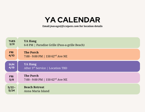 Join us for The Porch, our young adult ministry (ages 18–29), gathering on the second Friday of every month at 7 PM at Faith Covenant Church. Each night includes worship, biblical teaching, yummy snacks, fun porch-style games that help you meet new people, and breakout sessions designed for real, meaningful conversations. Together, we’ll explore what it means to pursue healthy relationships, build life-giving habits, follow God’s calling, and navigate the challenges of young adult life with faith.