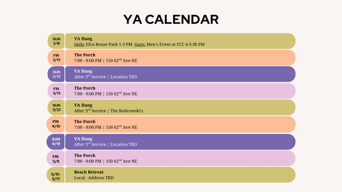 Each night includes worship, biblical teaching, delicious food, fun porch-style games that help you meet new people, and breakout sessions designed for real, meaningful conversations. Together, we’ll explore what it means to pursue healthy relationships, build life-giving habits, follow God’s calling, and navigate the challenges of young adult life with faith. Come hang out with friends, make new ones, and find a community that’s walking with Jesus and cheering each other on.