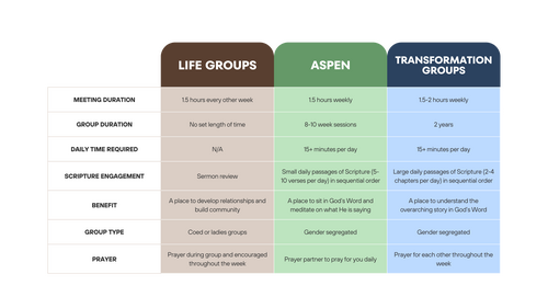 ASPEN is a discipleship-based small group ministry offering each participant their very own personal guide designed to lead you through daily relational and reflective Scripture readings. This guide is used in your weekly small group to facilitate conversations aimed at helping you become more like Jesus every day in every way.